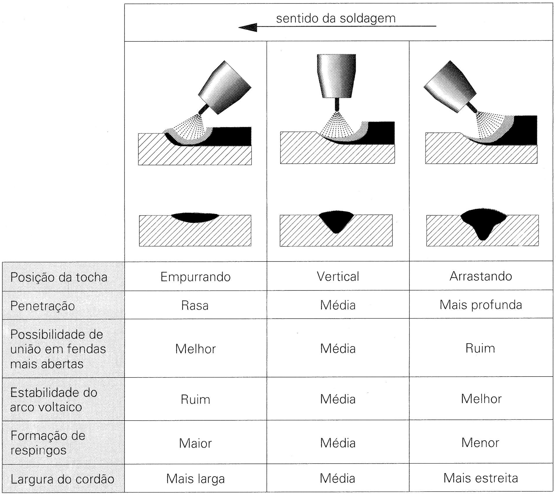 - O sentido da soldagem e o ângulo formado entre a tocha e a junta de soldagem devem ser mantidos constantes, pois interferem na penetração, estabilidade do arco, formação de respingos e a largura do cordão.
